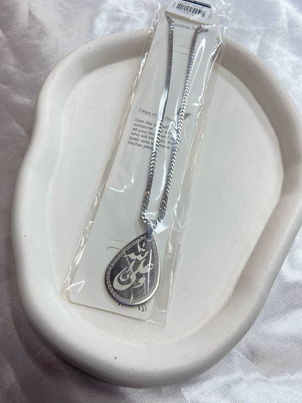 گردنبند استیل یونسکس – زنجیر نقرهای با پلاک اشکی حکاکی خطاطی مذهبی۱۵۰٬۰۰۰ 5%