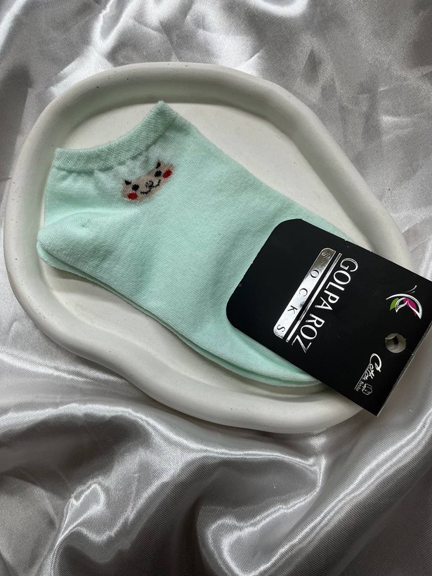 جوراب ساق کوتاه زنانه طرحدار با گلدوزی صورت گربه – موجود در رنگهای آبی، سبز پاستیلی و صورتی