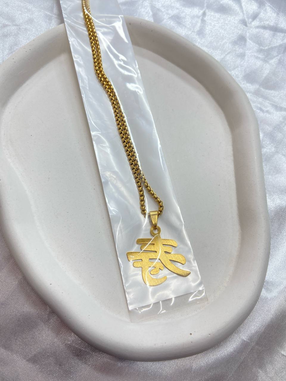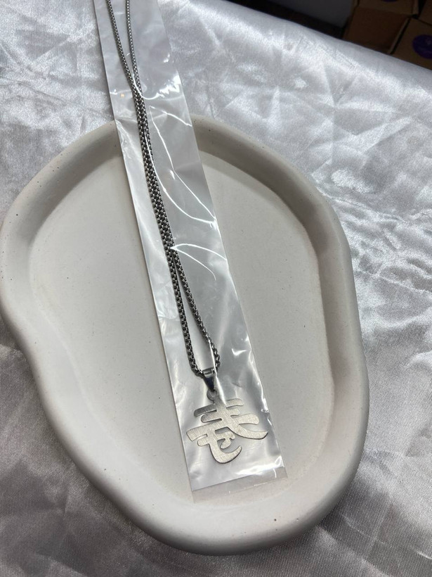 نوع طرح : پلاک حروف ژاپنی “اژدها” (龙) با برش لیزری دقیق، زنجیر ضخیم با بافت مربعی یکدست
