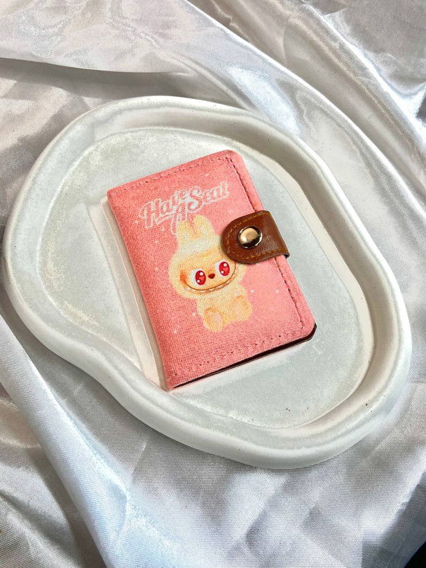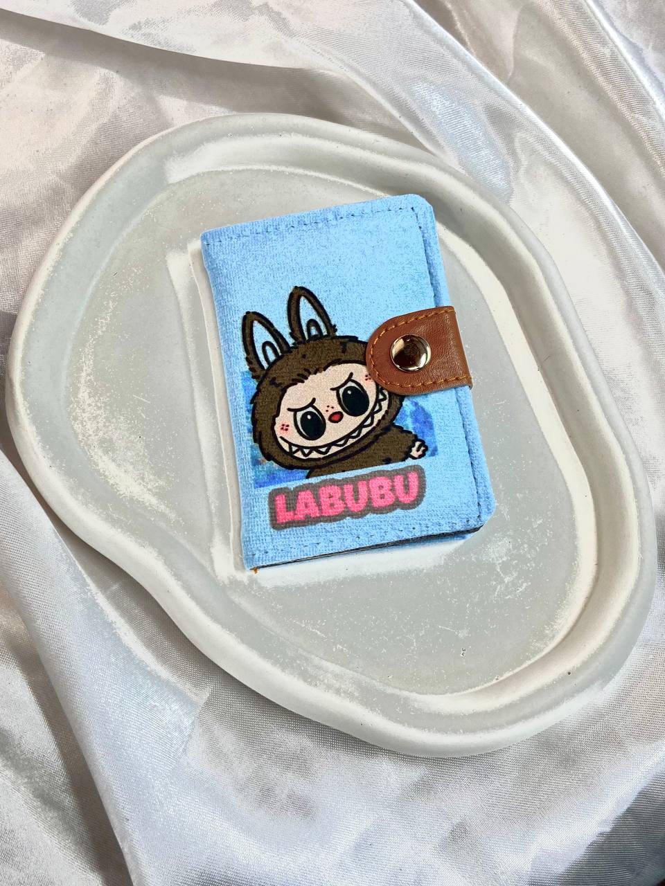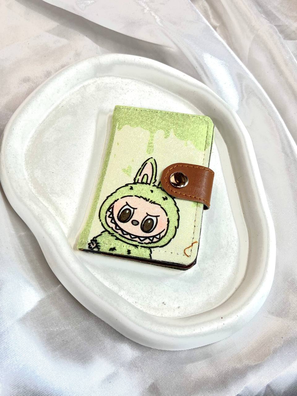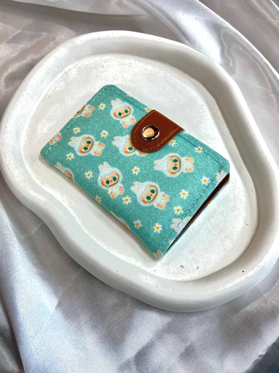 جا کارتی پارچهای با قفل دکمهای چرمی طرح لبوبو با رنگ بندی سبز آبی صورتی فیروزه ای