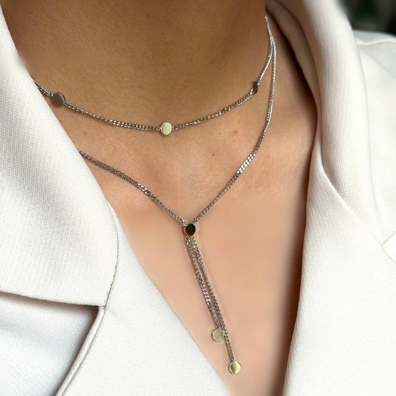 گردنبند دوبل نقرهای با المانهای دایرهای – طراحی مینیمال لوکس
