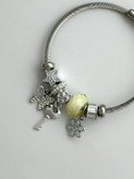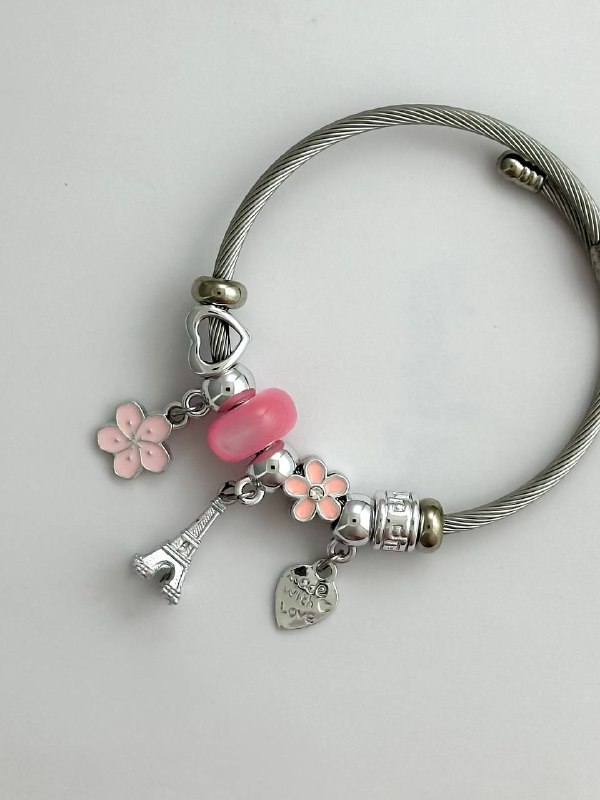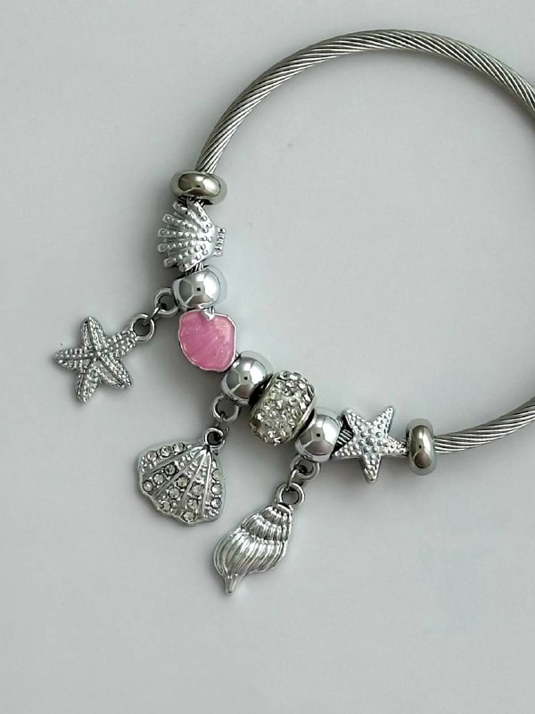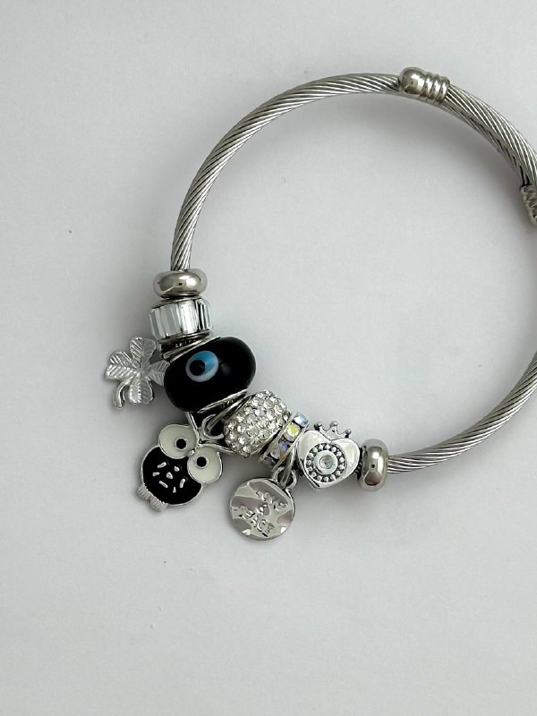 دستبند چارم فلزی نقرهای با مهره و آویز کریستالی – طراحی خاص لوکس
