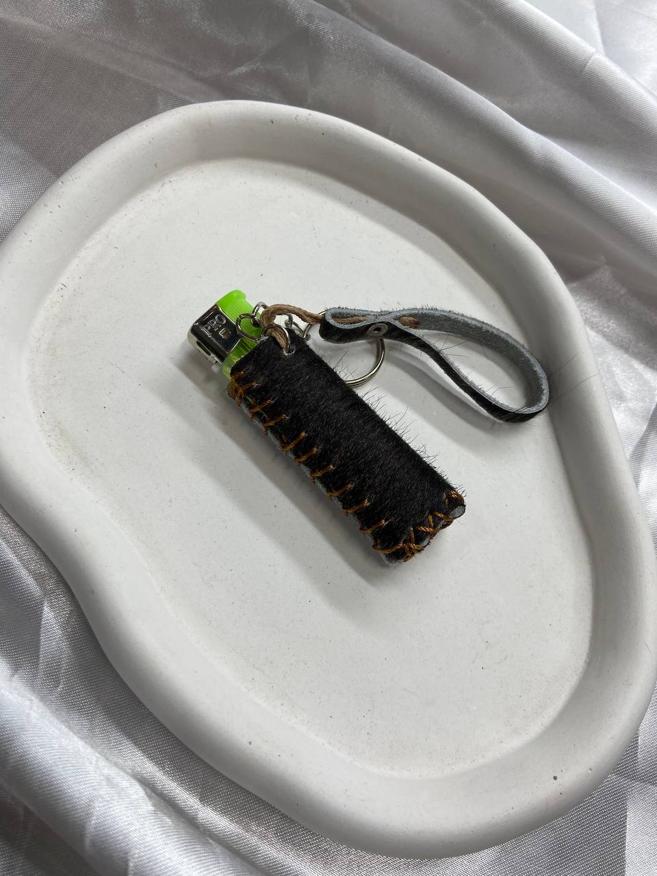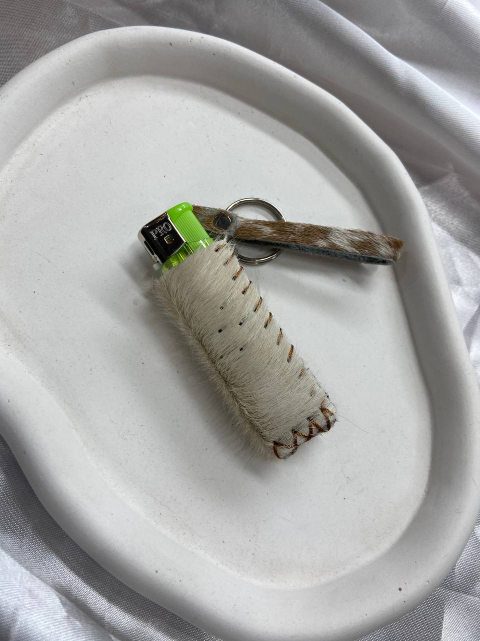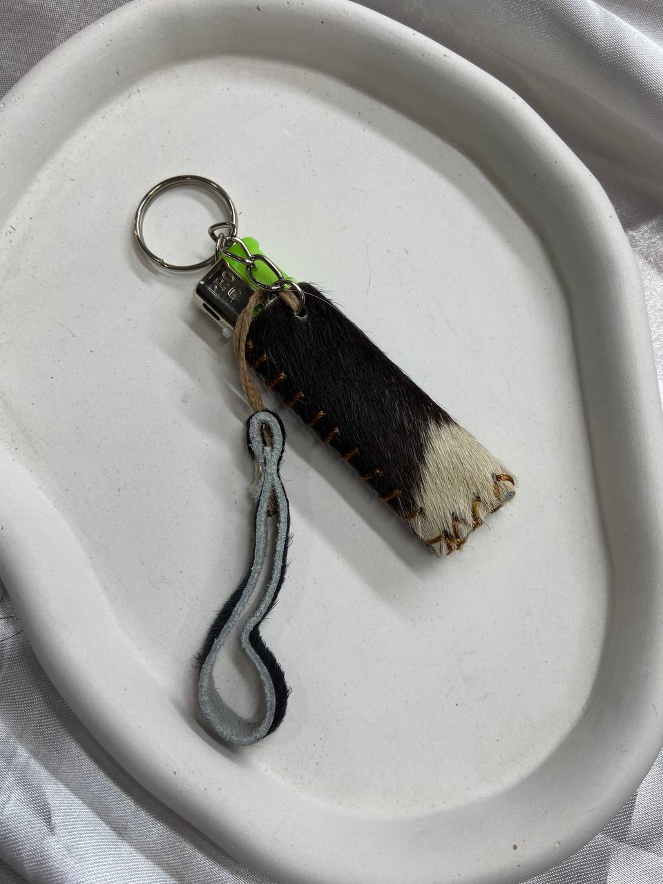 فندک جاکلیدی چرمی طرح پوست گاوی در رنگ بندی سفید قهوه ای مشکی