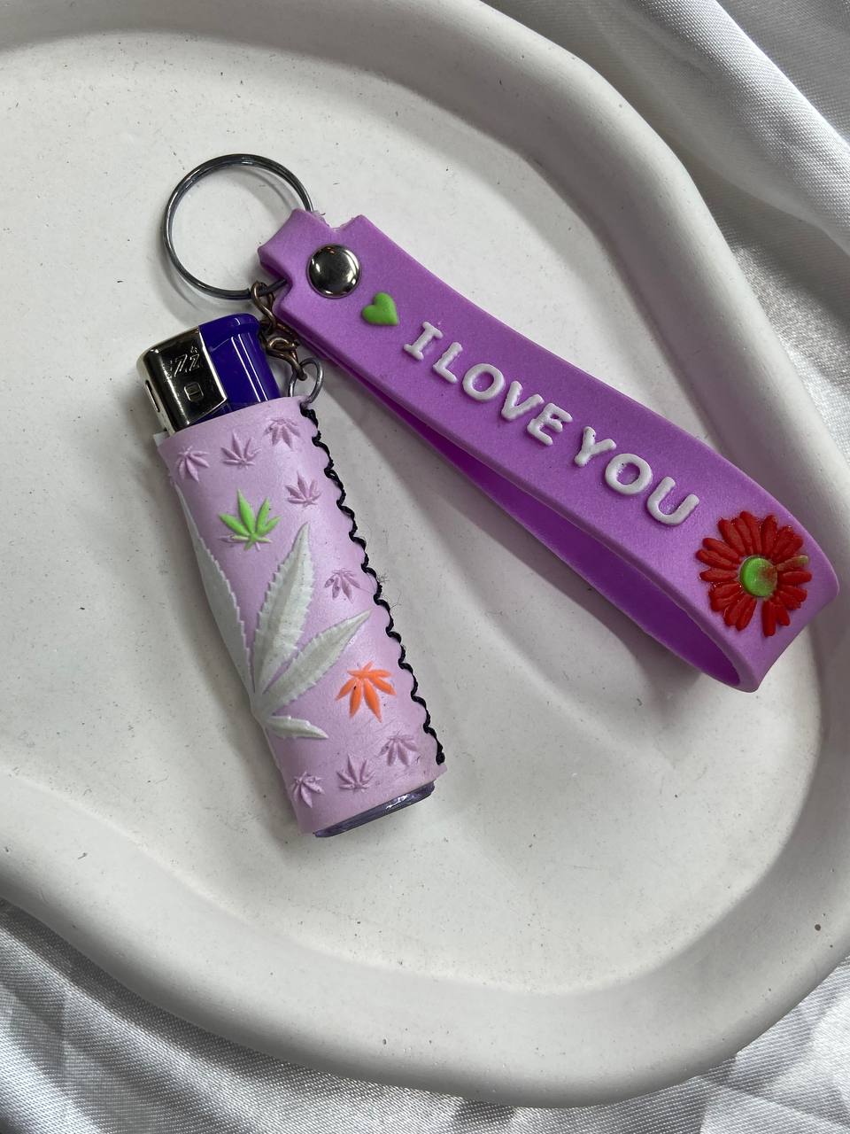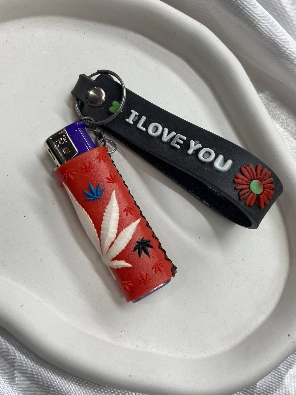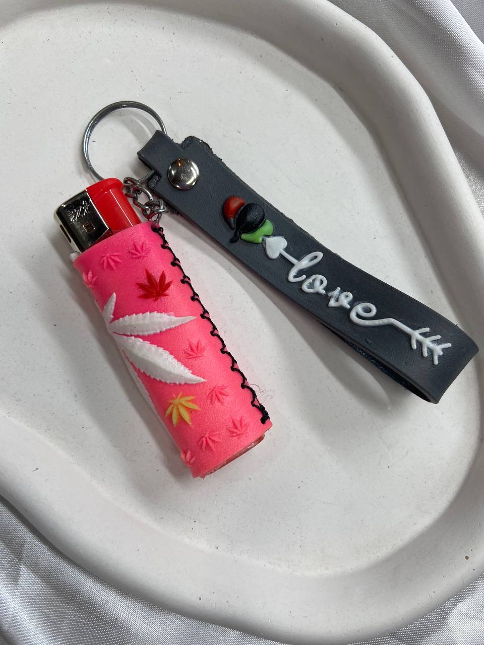 فندک جاکلیدی چرمی طرح برگ سهرنگ در رنگ بندی مشکی صورتی بنفش قرمز و نارنحی