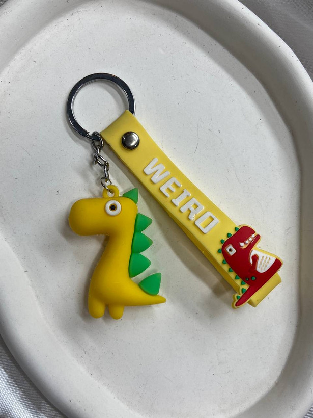 جاکلیدی سیلیکونی طرح دایناسور زرد با بند نوشته WEIRD