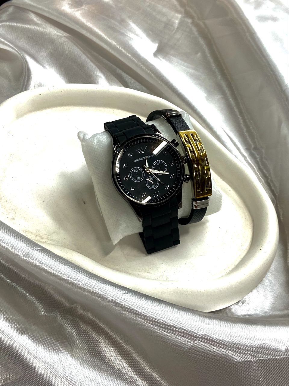 ست ساعت و دستبند مچی مردانه برند Emporio Armani با بند سیلیکونی مشکی و صفحه کرنوگراف مشکی۵۰۰٬۰۰۰ 5%