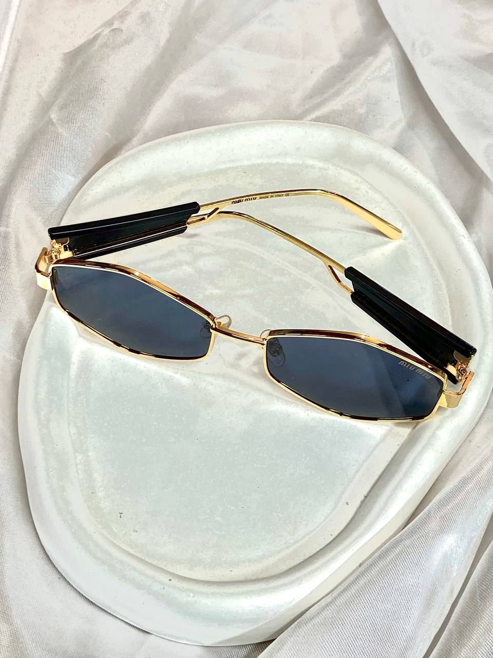 عینک آفتابی فریم باریک طلایی با دستههای سفید و مشکی و لنز دودی، طراحی Miu Miu۴۳۰٬۰۰۰ 5%